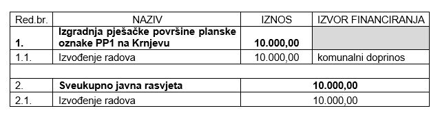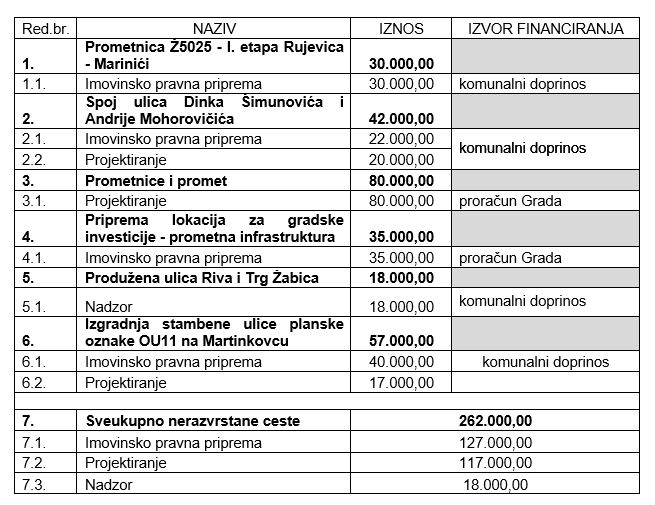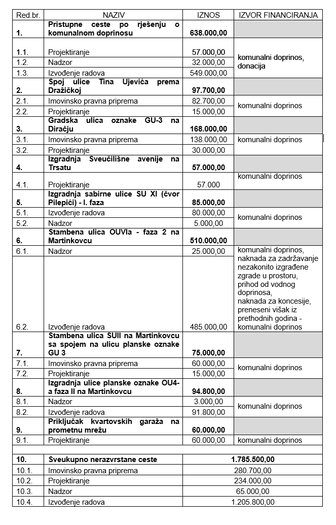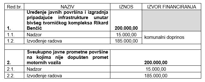 Gradnja građevina komunalne infrastrukture koje će se graditi u uređenim dijelovima građevinskog područja u ukupnom iznosu od 632.000,00 eura, financirat će se iz: komunalnog doprinosa u iznosu od 517.000,00 eura i proračuna Grada u iznosu od 115.000,00 eura kako slijedi: