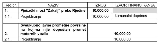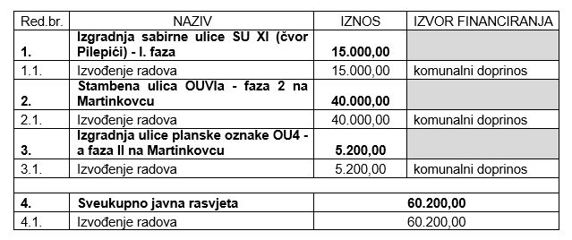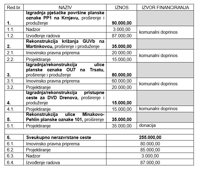 Postojeće građevine komunalne infrastrukture koje će se rekonstruirati u ukupnom iznosu od 265.000,00 eura financirat će se iz komunalnog doprinosa u iznosu od 230.000,00 eura i donacije u iznosu od 35.000,00 eura.
