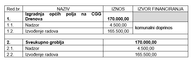 Gradnja građevina komunalne infrastrukture koje će se graditi radi uređenja neuređenih dijelova građevinskog područja u ukupnom iznosu od 1.855.700,00 eura, financirat će se iz: komunalnog doprinosa u iznosu od 1.236.600,00 eura, prenesenog viška – komunalni doprinos u iznosu od 219.400,00 eura, naknade za koncesije u iznosu od 60.700,00 eura, naknade za zadržavanje nezakonito izgrađene zgrade u prostoru u iznosu od 15.000,00 eura, vodnog doprinosa u iznosu od 1.000,00 eura te donacija u iznosu od 323.000,00 eura kako slijedi: