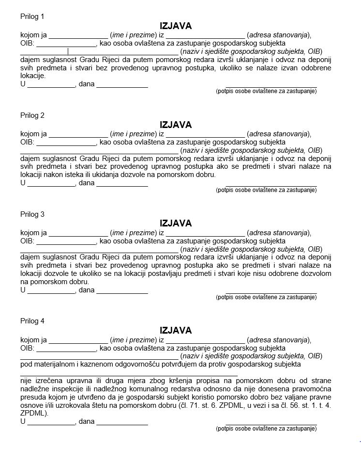 10. vlastoručno potpisana izjava ponuditelja kojom se daje suglasnost pomorskom redaru za uklanjanje i odvoz na deponij svih predmeta i stvari bez provedenog upravnog postupka ako se predmeti i stvari nalaze na lokaciji nakon isteka ili ukidanja dozvole na pomorskom dobru (Prilog 2). Potpis na Izjavi mora biti ovjeren po javnom bilježniku,